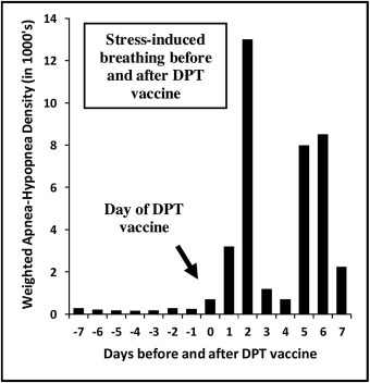 В австралийском исследовании 1991 года младенцам под матрасы устанавливали дыхательные мониторы, чтобы отслеживать точные изменения ритма дыхания до и после вакцинации. Исследование показало, что после вакцинации АКДС количество эпизодов, при которых дыхание резко замедлялось или вовсе прекращалось, увеличивалось, причём неравномерно, а с пиками, продолжающимися в течение нескольких недель (см. график).