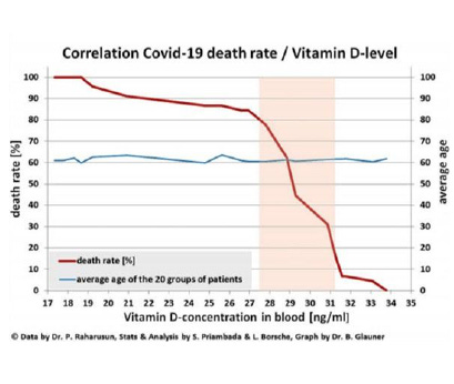 Корреляция между уровнем витамина Д и смертностью от ковида. При уровне витамина Д выше 34 нг/мл смертность от ковида становится нулевой.