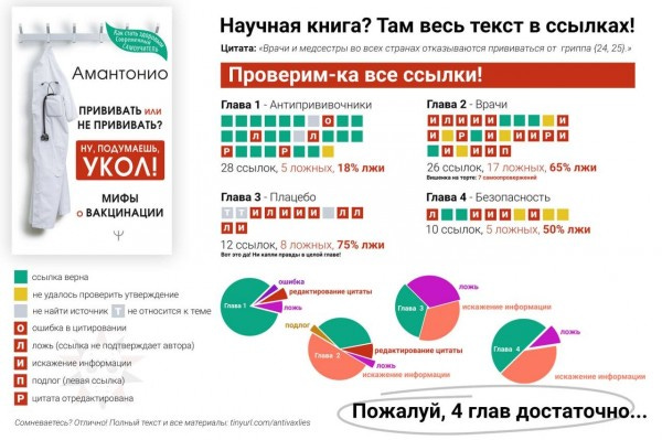 Претензия критика: "Учитывая, что прививка от гриппа необязательная, ничего удивительного. Однако, их ожесточённое сопротивление выражается в простом непоходе на необязательную прививку – так что слово «сопротивляются» тут явный перебор. Сопротивляться – это одно, а пипиську положить на это дело – другое. Кстати, там же упоминается, что в Румынии в какой-то год прививалось до 98% врачей – но такую цифру упоминать в этой книге никто не станет, разумеется. Но Статья нашлась полностью, ставим автору «искажение фактов».