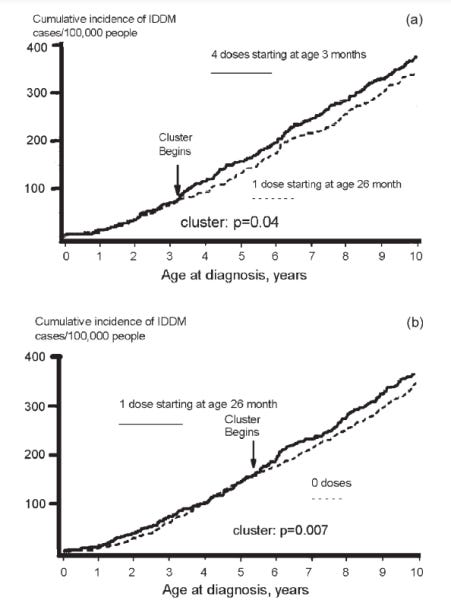 Более того, Классен показал, что у привитых в трехмесячном возрасте кластер диабета начинается примерно в 3 года, а у привитых в двухлетнем возрасте, аналогичный подъём начинается на два года позже, примерно в 5 лет:
